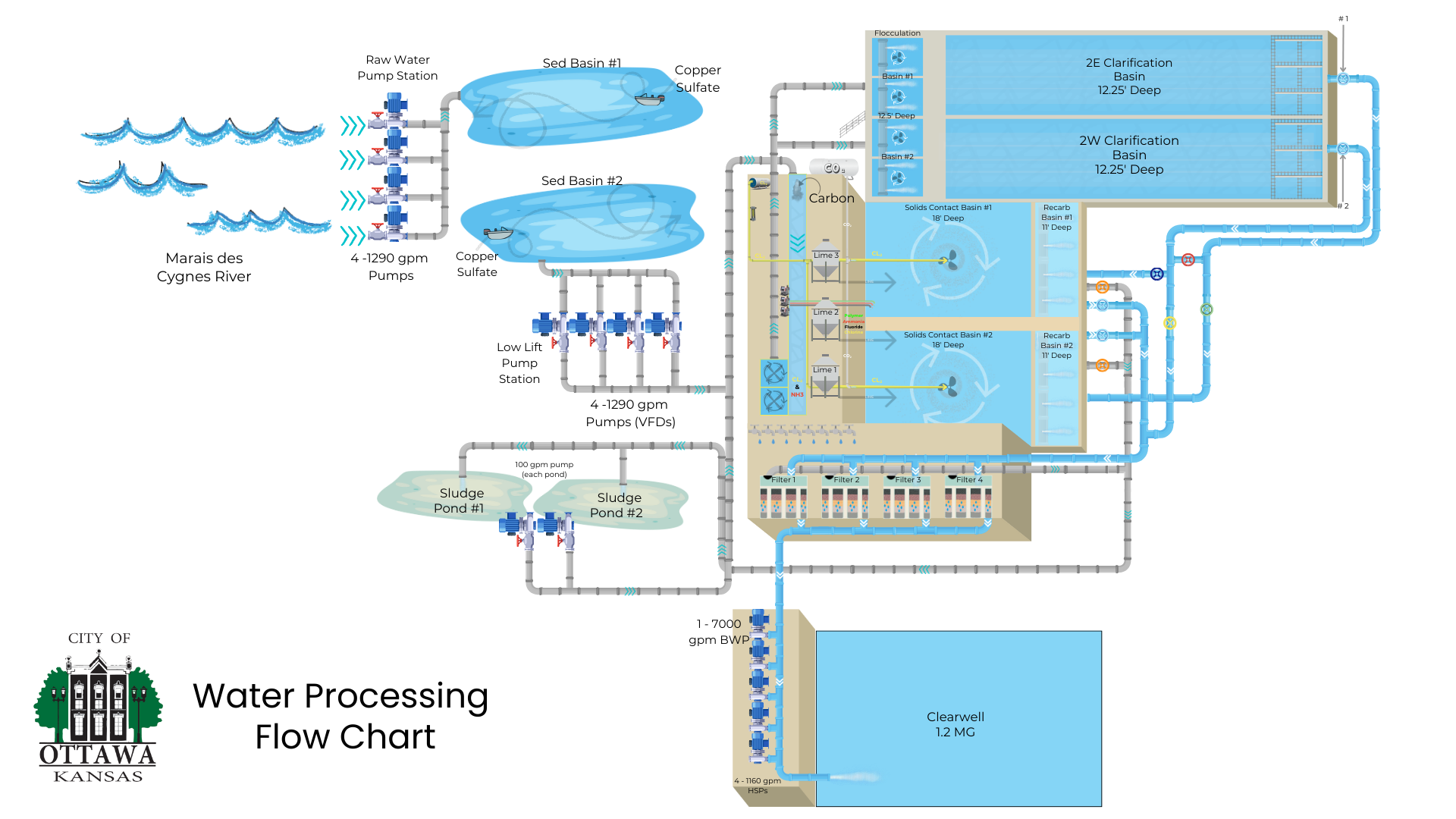 The City provides water service to over 5,000 meters with average production of over 570 million gallon per year also supplying the City of Princeton and three Rural Water Districts. Source water is the Marais des Cygnes River. The City of Ottawa is a member of the Marais des Cygnes River Water Assurance District, and has purchased storage in Pomona and Melvern Reservoirs for drought resiliency.